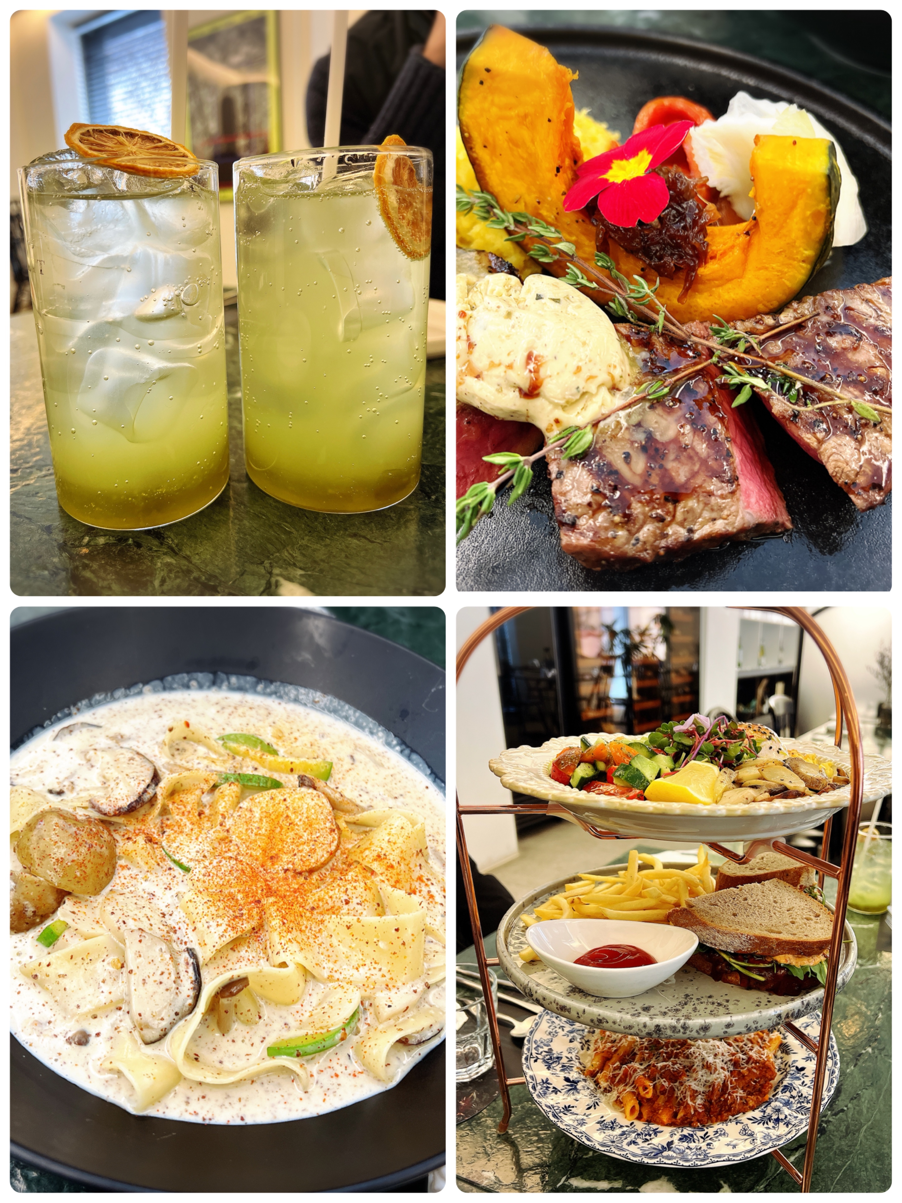 저희 가족은 브런치 3단 플래터와 들깨 버섯 크림 파스타, 반가 어니언 채끝 스테이크, 청포도 에이드, 콜라를 주문했습니다.