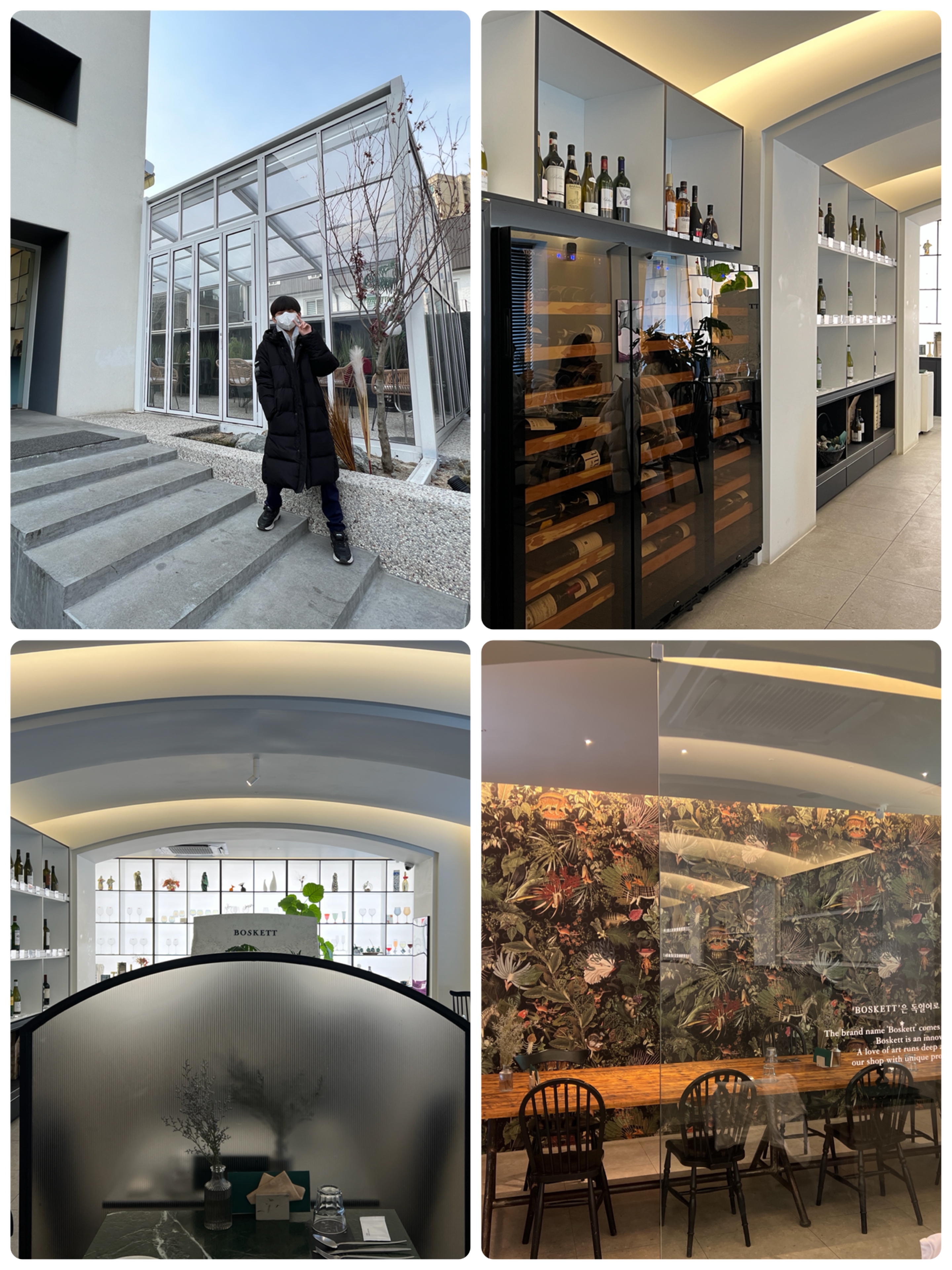 독일어로 '숲'을 뜻하는 어원입니다. '서울 도심 속의 휴식'이라는 콘셉트의 내부 공간이 참으로 매력적인 곳입니다. 보스켓은 와인샵을 함께 운영하며, 맛 좋은 이탈리안 요리로 구성된 브런치와 디너를 제공하고 있습니다. 커피와 다양한 에이드 등 음료도 함께 제공하고 있어서 아이들과 함께 가기에도 좋은 곳입니다. 간혹 노 키즈존인 곳을 만나 기분을 망칠 때가 있었는데, 이곳은 온 가족이 함께 즐길 수 있는 곳이어서 좋았습니다. 보스켓 주차장 건너편에 작은 놀이터가 있어서 어린 자녀를 둔 가족들도 얼마든지 방문할 수 있는 곳입니다. 생각날 때마다 자주 방문할 것 같은, 아주 맘에 드는 곳입니다.